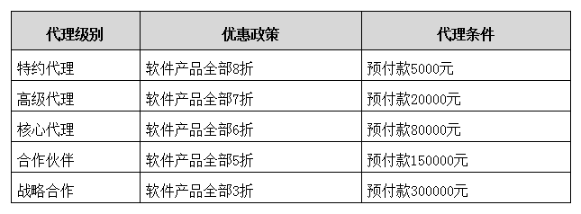 3、代理分为以下级别,代理级别和优惠政策以及代理条件见下表: